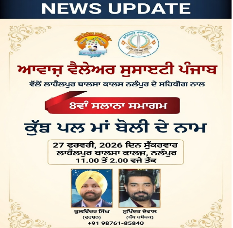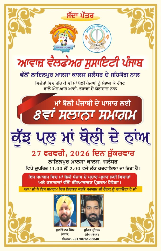 ਜਲੰਧਰ(ਜਸਪਾਲ ਸਿੰਘ)ਆਵਾਜ਼ ਵੈਲਫੇਅਰ ਸੁਸਾਇਟੀ ਪੰਜਾਬ ਵੱਲੋਂ ਲਾਇਲਪੁਰ ਖ਼ਾਲਸਾ ਕਾਲਜ ਜਲੰਧਰ ਦੇ ਸਹਿਯੋਗ ਨਾਲ ਵਿਦੇਸ਼ਾਂ ਵਿਚ ਰਹਿ ਕੇ ਵੀ ਮਾਂ ਬੋਲੀ ਪੰਜਾਬੀ ਨੂੰ ਸੰਭਾਲ ਕੇ ਰੱਖਣ ਵਾਲੇ ਐਨ.ਆਰ.ਆਈ. ਭਰਾਵਾਂ ਦੇ ਯੋਗਦਾਨ ਨਾਲ ਮਾਂ ਬੋਲੀ ਪੰਜਾਬੀ ਦੇ ਪਾਸਾਰ ਲਈ8ਵਾਂ ਸਲਾਨਾ ਸਮਾਗਮ ਕੁੱਝ ਪਲ ਮਾਂ ਬੋਲੀ ਦੇ ਨਾਂਅ 27 ਫਰਵਰੀ, 2026 ਦਿਨ ਸ਼ੁੱਕਰਵਾਰ ਲਾਇਲਪੁਰ ਖ਼ਾਲਸਾ ਕਾਲਜ, ਜਲੰਧਰ ਵਿਖੇ ਦੁਪਹਿਰ 11.00 ਤੋਂ 2.00 ਵਜੇ ਤੱਕ ਕਰਵਾਇਆ ਜਾ ਰਿਹਾ ਹੈ।