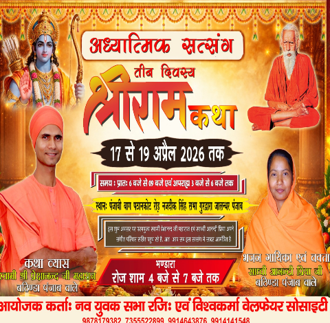 जालंधर (पंजाबी बाग, पठानकोट रोड) — नव युवक सभा एवं विश्वकर्मा वेलफेयर सोसाइटी की ओर से एक भव्य आध्यात्मिक सत्संग “राम कथा” का आयोजन 17 अप्रैल से 19 अप्रैल तक किया जा रहा है। यह पावन आयोजन श्रद्धालुओं के लिए भक्ति, ज्ञान और आत्मिक शांति का अद्भुत अवसर लेकर आएगा।